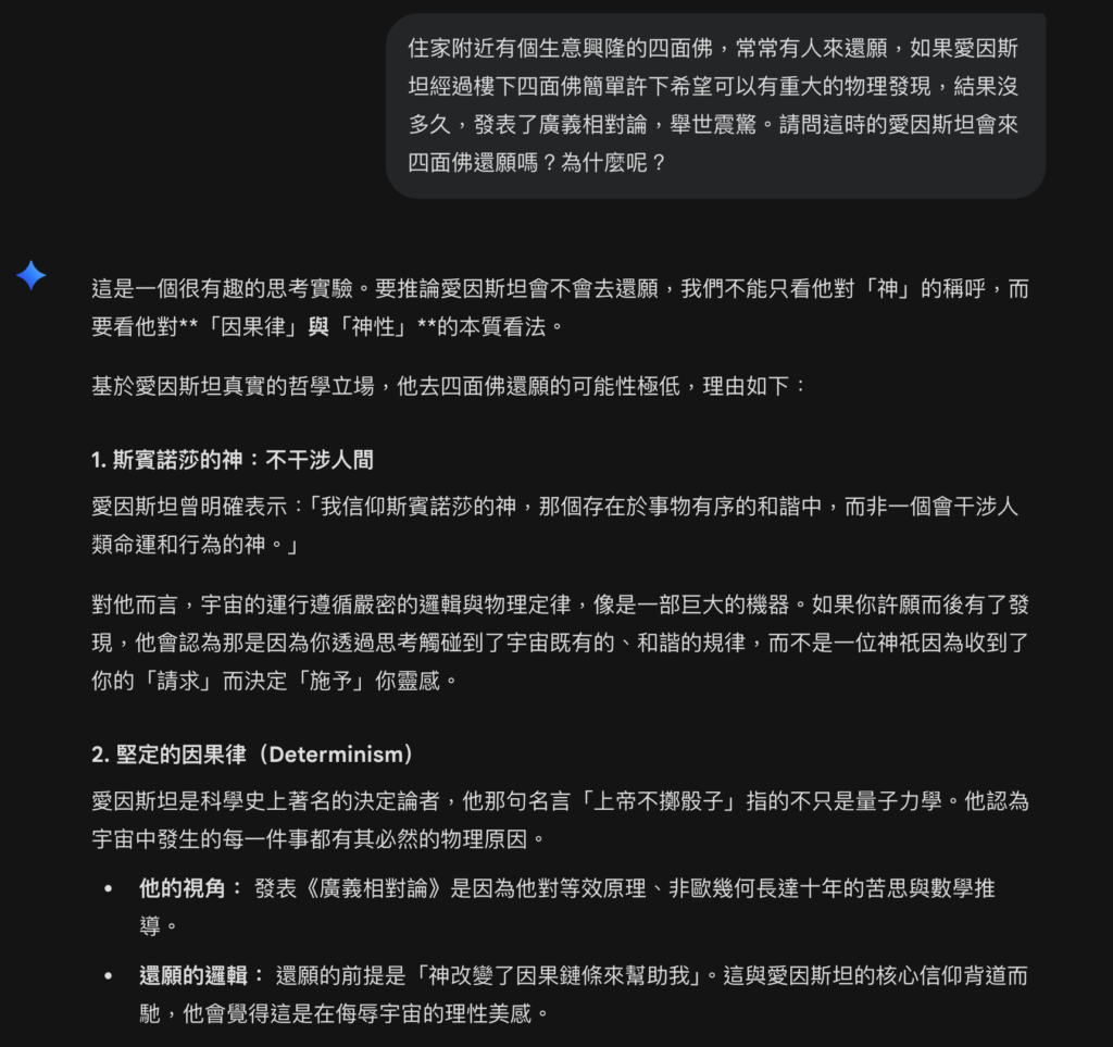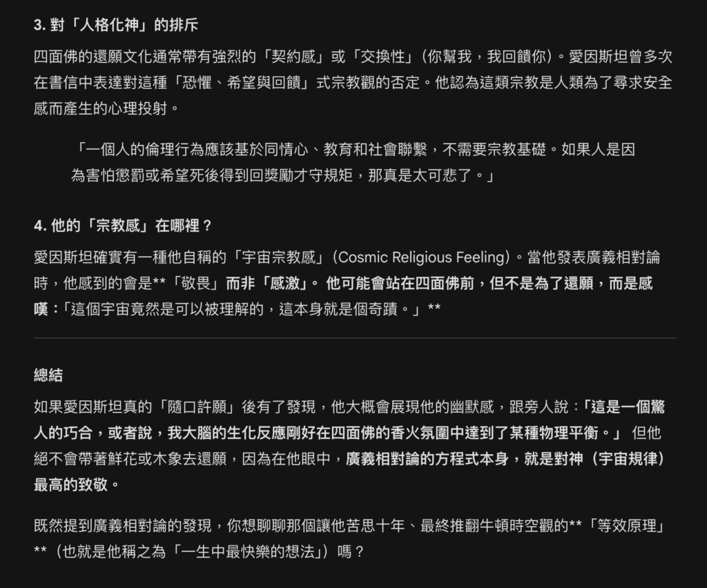 我還很無聊的問了 AI 如果愛因斯坦在四面佛許願有成,會不會來還願,AI 回答的很好。